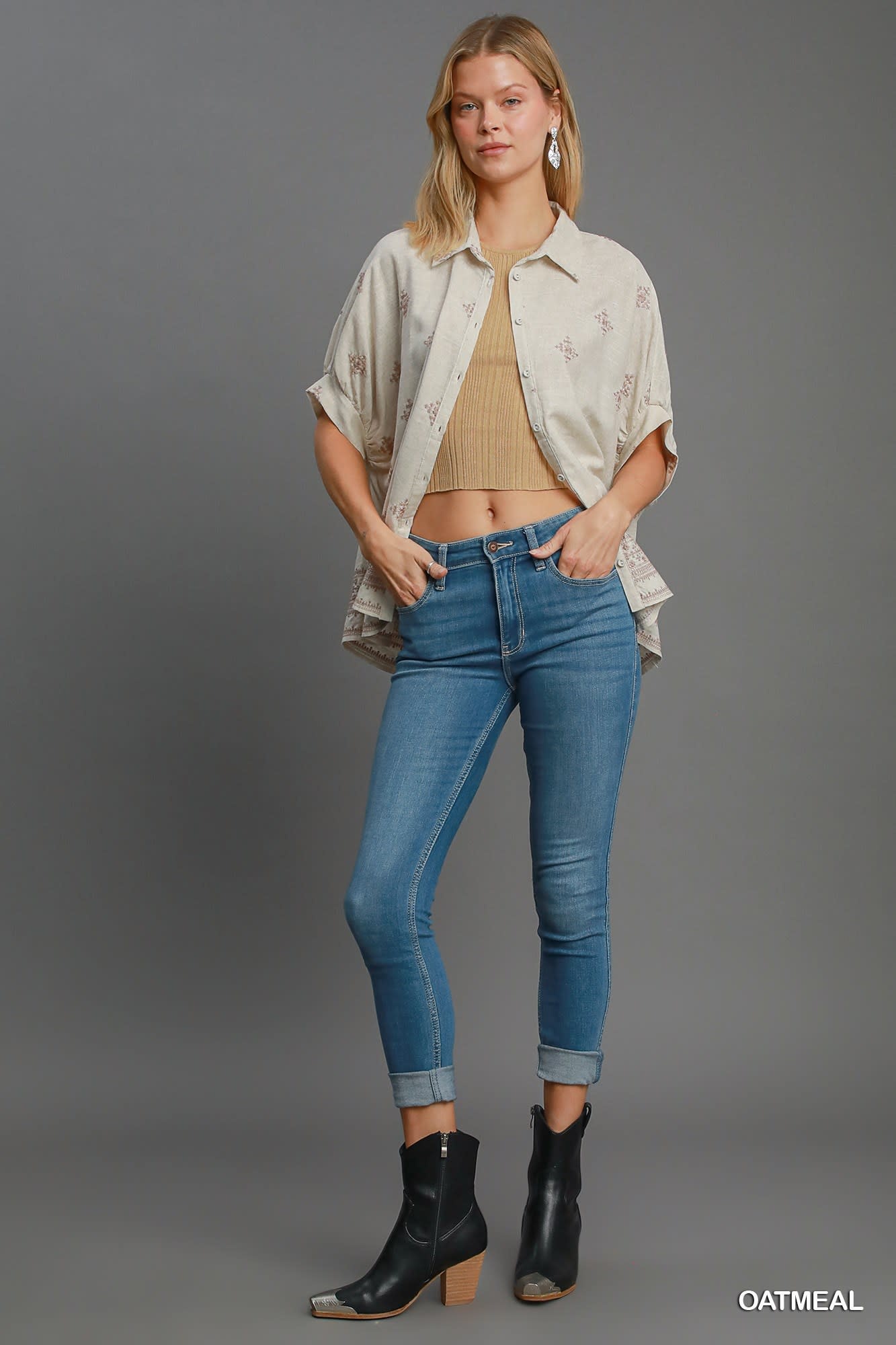 Designed with a relaxed, slightly oversized fit, this top offers a structured yet breezy feel. The full button-down front and traditional collar provide a polished touch, while the bold patterns keep the vibe undeniably "sassy." Whether you're heading to a livestock show, a weekend in the Hill Country, or just looking to elevate your everyday denim, this top is a durable and stylish staple that transitions seamlessly through the seasons.