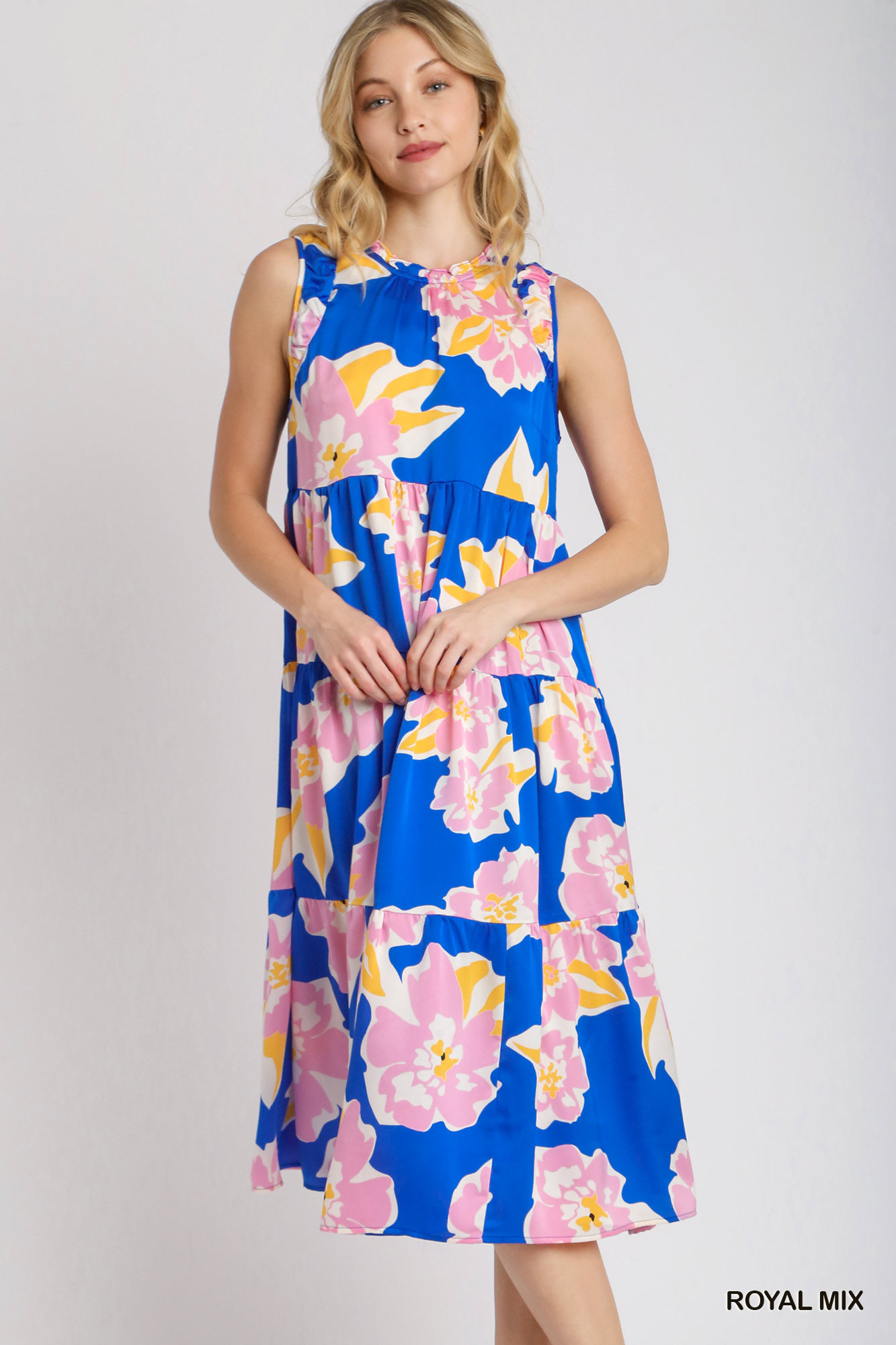 Review Sleeveless Tiered Maxi Floral Print Dress with Ruffle Neckline & Back Keyhole