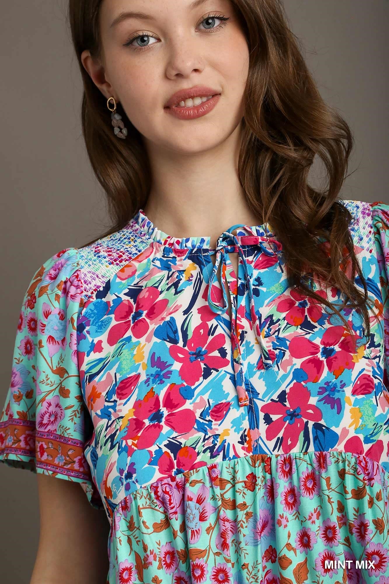 Review Mixed Print Smocked Shoulder Top with Drawstring Detail