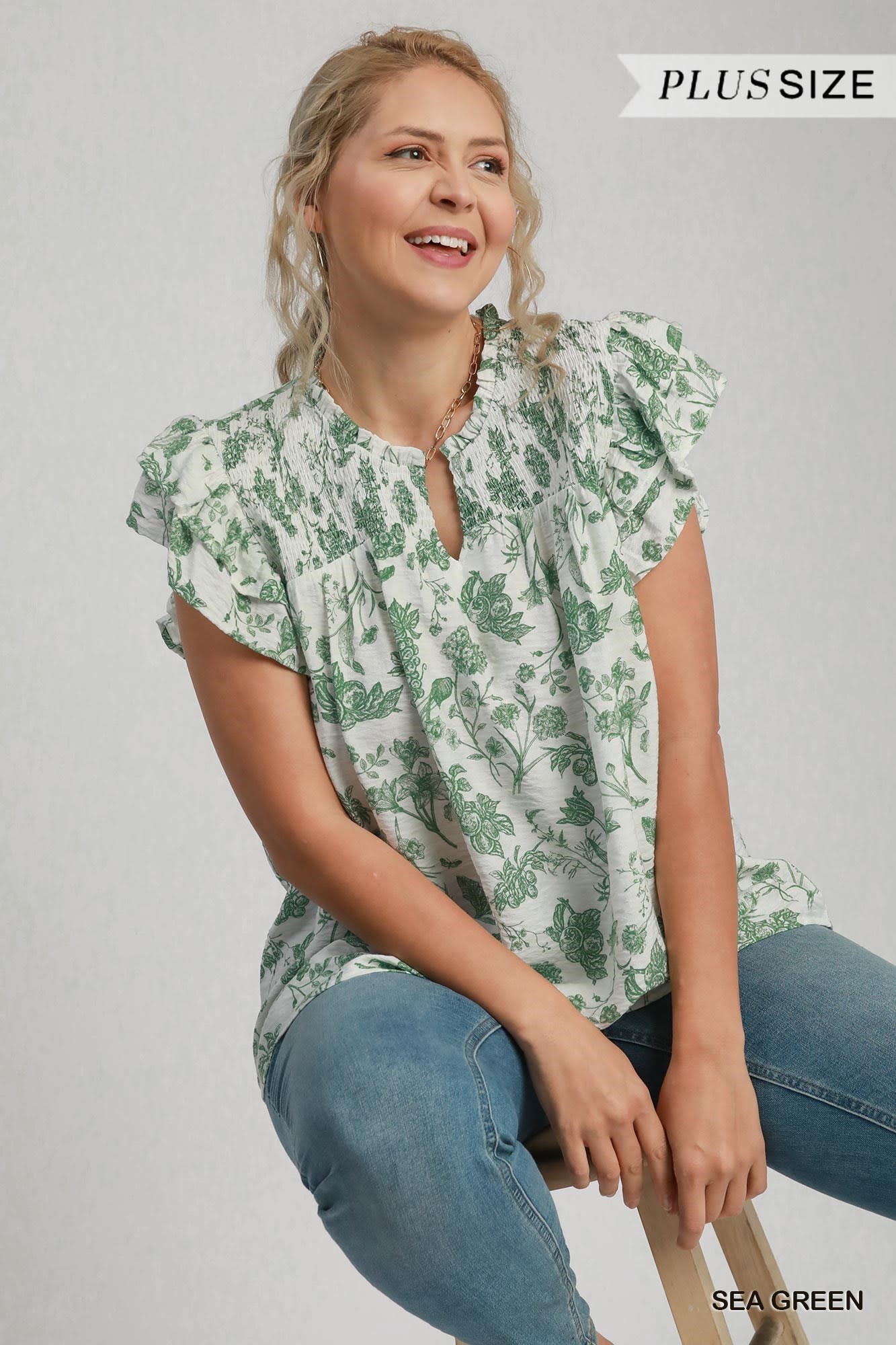 Review Two Tone Boxy Cut Floral Print with Smocked Details & Ruffle Sleeves Sea Green 1XL